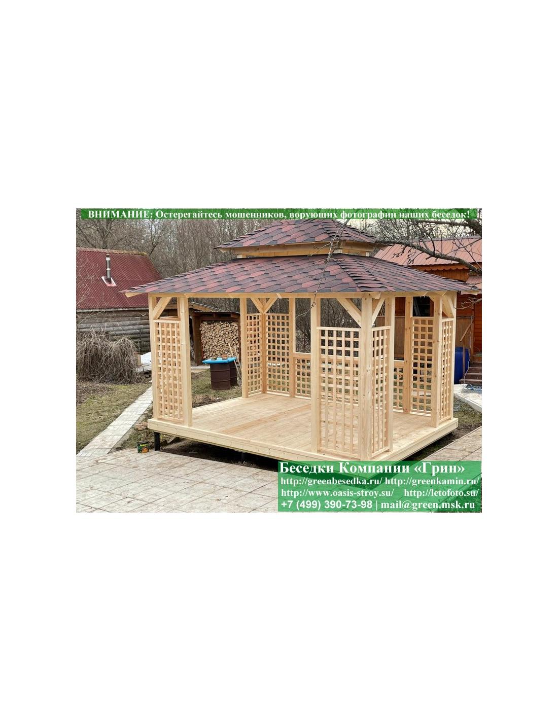 Беседка "Шатер для дачи 3х4" поставляется с 4-мя входами, стандартном варианте. Возможно изменение количества входов. Беседка изготавливается с полом или без пола, с двухъярусной крышей с воздушным клапаном. Установка беседки без пола производится на подготовленную площадку, выложенную плиткой или залитой бетоном. В качестве несущих стоек используется строганый брус 100х100 (90х90) мм, естественной влажности. На крышу беседки укладывается мягкая битумная черепица: Коричневых, Зеленых и Бордовых цветов. Срок изготовления и монтажа беседки на участке 5-10 дней. Беседки поставляются в не крашеном виде.
