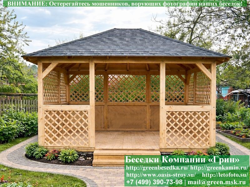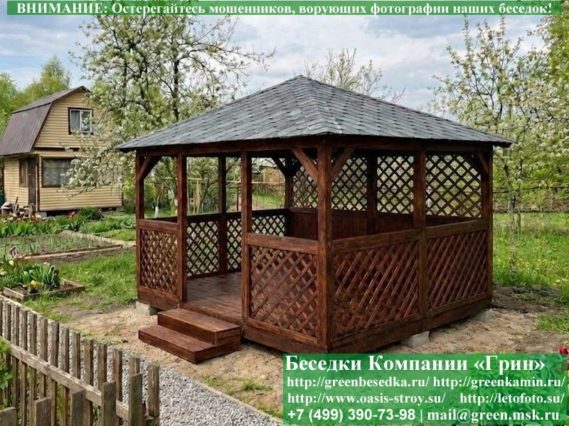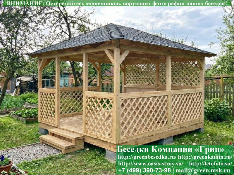 Красивая летняя деревянная беседка для дачи, загородного дома 4х4 метра. Фото и цены. В интернет-магазине 'Оазис-Строй' вы можете купить элегантную летнюю беседку из дерева для дачи, сада, отдыха 4х4 под ключ с монтажом в Москве и Московской области. Изготовление и строительство интересных летних деревянных беседок  по готовым проектам размерами 4х4 метра возможно так же в Тверской, Калужской, Брянской, Владимирской, Ярославской, Рязанской, Орловской, Ивановской, Тульской, Костромской, Новгородской, Липецкой, Ленинградской и некоторых других областях.