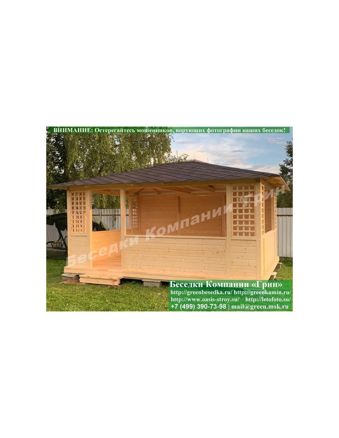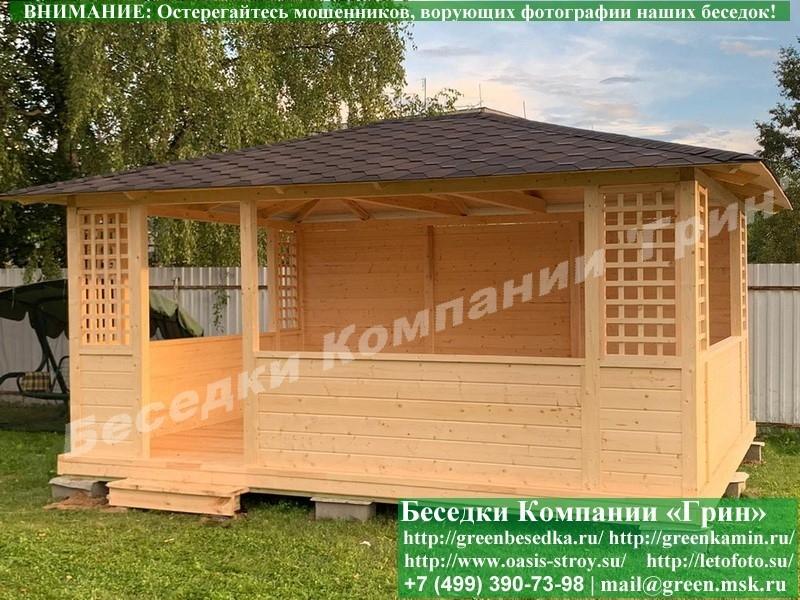 Летняя деревянная беседка для дачи, загородного дома 4х5 метра. Фото и цены. В интернет-магазине "Оазис-Строй" вы можете купить красивую летнюю беседку из дерева для дачи, сада, отдыха 3,5х4,5 под ключ с монтажом в Москве и Московской области. Изготовление и строительство элегантных летних деревянных беседок по готовым проектам размерами 4х5 метров возможно так же в Калужской, Тверской, Владимирской, Тульской, Ярославской, Ивановской, Рязанской, Брянской, Орловской, Новгородской, Липецкой, Костромской, Ленинградкой и некоторых других областях.