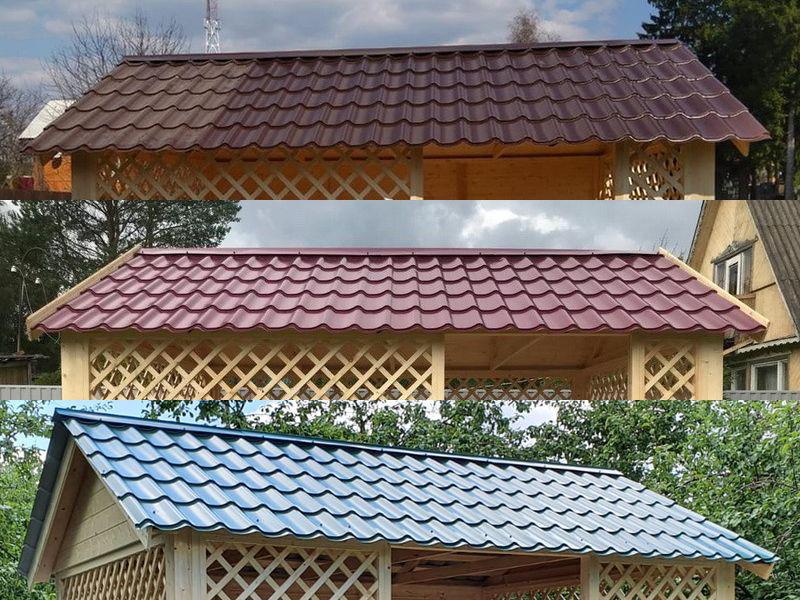 В стандартной поставке в виде кровли на крышу хозблоков, веранд, бытовок, беседок 3х5 метров кладется ондулин (мягкий шифер). Вы можете дополнительно заменить его на более надежную металлочерепицу. Цена 26000 руб.