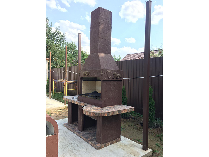 Дополнительно топка оснащена удобной решеткой. Ее конструкция допускает использование шампуров, решетки-гриль, разных емкостей — вроде большой кастрюли или чугунка. Если нужно, комплекс барбекю оснащается подъемным механизмом.