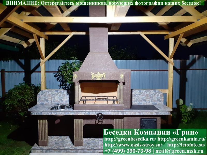 - Невысокая задняя стенка (по типу скинали), которая полностью закрывает столешницы. Она защищает стену беседки или забор от брызг жира и других загрязнений.
