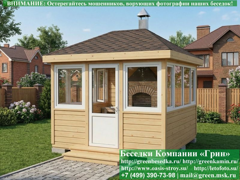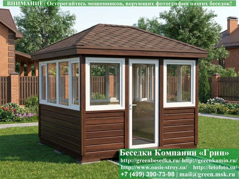 Застекленная беседка 3х3 метра изготавливается из сосны, по специальной каркасной технологии. При строительстве беседок используется сухое дерево камерной сушки. В качестве каркаса беседки используется  очень надежная Имитация бруса 17х140 мм. В отличие от вагонки, она не гнется, не набухает и не идет трещинами. Имитацию бруса можно заменить на блокхаус (имитация бревна). Используется усиленная конструкция крепления стенок. В качестве несущих стоек используется строганый брус. По углам дополнительно устанавливается брус 90х90 мм. На пол кладется толстая сухая строганая доска 35 мм (не шпунт). Пол обрабатывается антисептиком. Половую доску можно заменить на шпунтованную 36 мм или террасную доску ДПК. В беседку устанавливаются однокамерные пластиковые окна фирмы "Века". Окна заказываются в Лемана-Про. Количество застекленных сторон и количество открывающихся окон обговаривается дополнительно. Устанавливается железная, алюминиевая или пластиковая дверь. Беседки изготавливаются с односкатной, двухскатной, четырехскатной крышей. На крышу кладется металлочерепица, мягкая черепица или профлист: Коричневых, Зеленых, Бордовых, Серых цветов. Срок изготовления и монтажа беседки на участке составляет 14-18 дней (срок изготовление пластиковых окон). Беседки поставляются в не крашеном виде. Возможна покраска беседок в цеху или полная обработка антисептиком. Дополнительно предлагаем установку в деревянные беседки с пластиковыми окнами недорогих безопасных быстровозводимых печей-барбекю, установка в течение дня, или более дорогих и сложных комплексов-барбекю и мангалов-барбекю из кирпича.